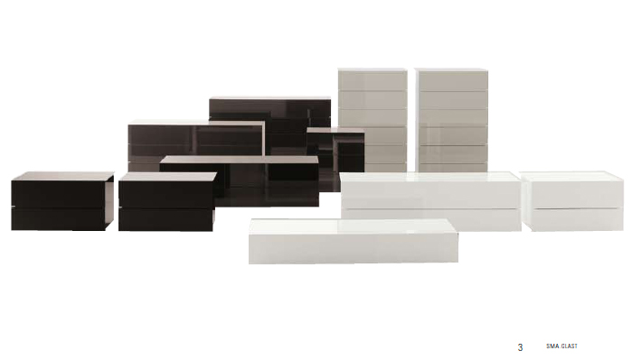 Спальня СМА SMA Glast. Различные варианты тумбочек и комодов в лакированном чёрном и белом цветах.
